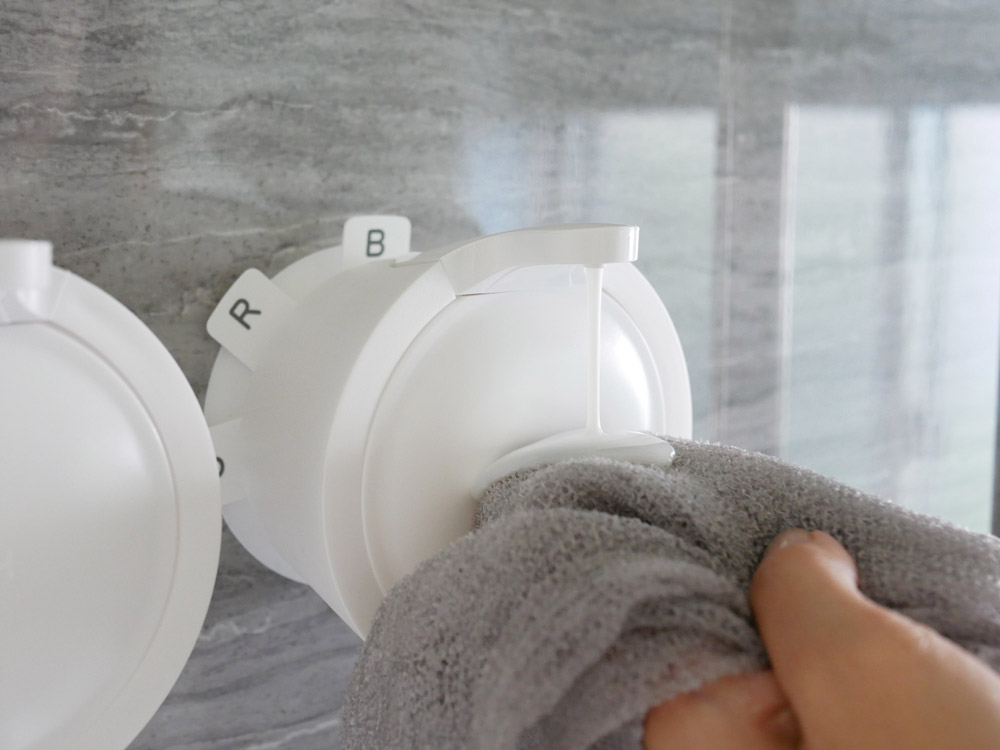 半年に一回とかかな、こんな感じで洗剤補充してまたタイルにくっつけて使ってます。